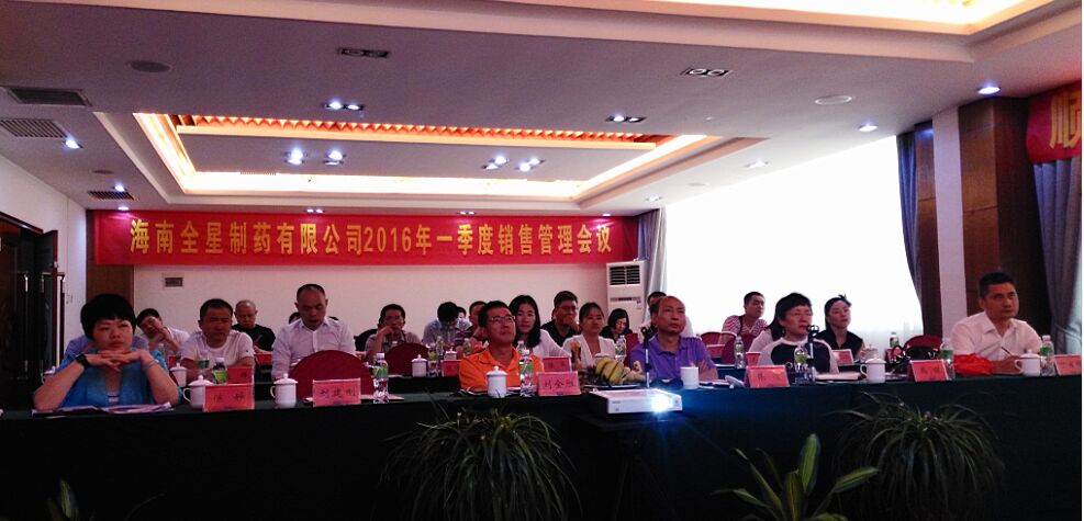 2016年4月14日-15日,海南全星制藥有限公司在烏蘭大酒店召開(kāi)2016年一季度銷售管理會(huì)議,公司董事長(zhǎng)兼總經(jīng)理劉全勝及各部門(mén)總監(jiān)、營(yíng)銷部全體成員及全國(guó)各省區(qū)經(jīng)理出席會(huì)議,會(huì)議由營(yíng)銷總監(jiān)丁月祥主持。